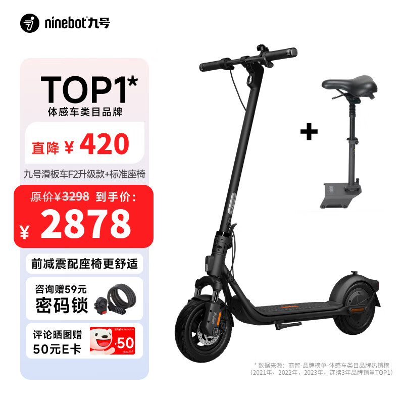 九号(Ninebot)电动滑板车F2升级款+可折叠座椅套装双筒前减震成人学生便携智能可折叠号防滑体感车价格:2878.00元!