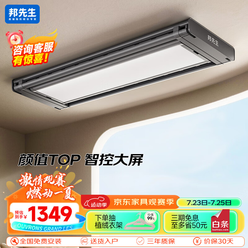 邦先生超薄隐形嵌入式电动晾衣架全自动智能升降阳台消毒凉晒衣机M22C灰价格:1349.00元!