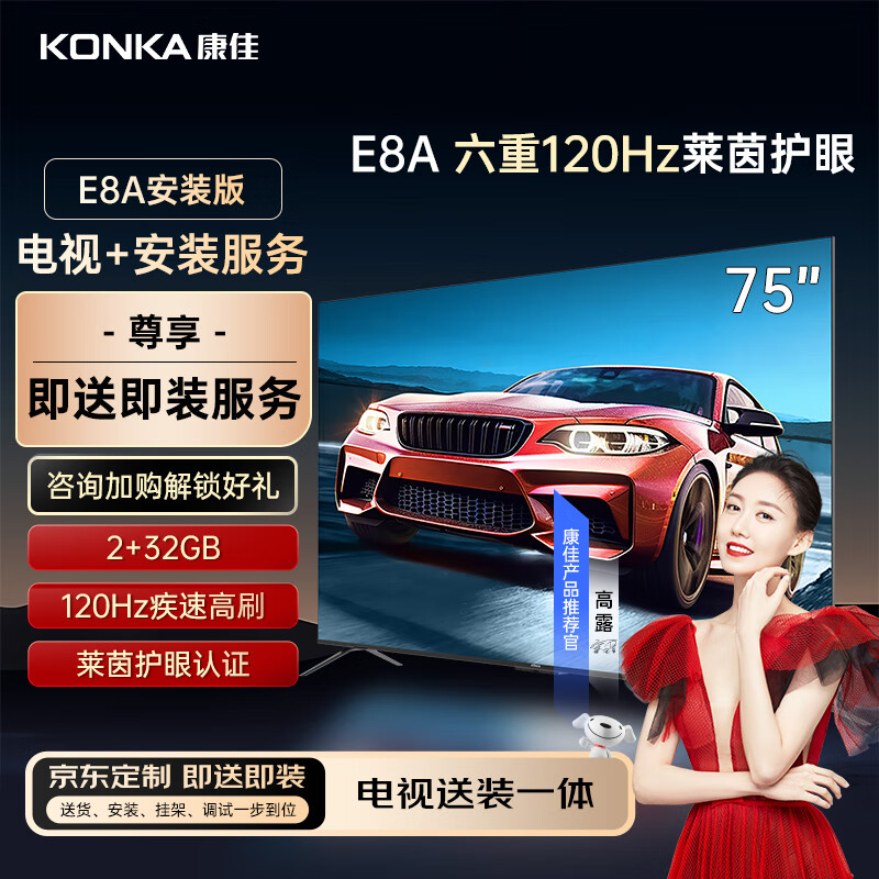 康佳电视 75E8A 75英寸【包安装版】120Hz高刷护眼 智能液晶平板电视机【服务套装】送装一体含挂架价格:2998.00元!