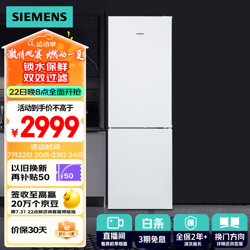 西门子(SIEMENS) 321升风冷无霜双门大容量家用冰箱 双效过滤 超大冷藏 白色 以旧换新(KG32NV21EC)价格:2999.00元!