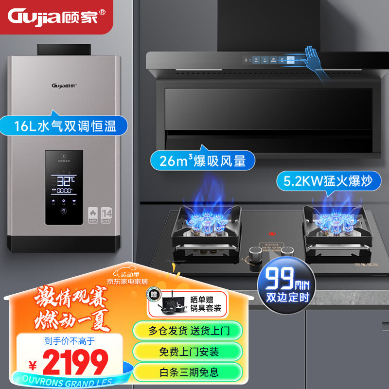 顾家(Gujia)顶侧双吸油烟机燃气灶热水器厨房三件套26立方大吸力5.2kW燃气灶16L热水器(天然气)价格:2699.00元!