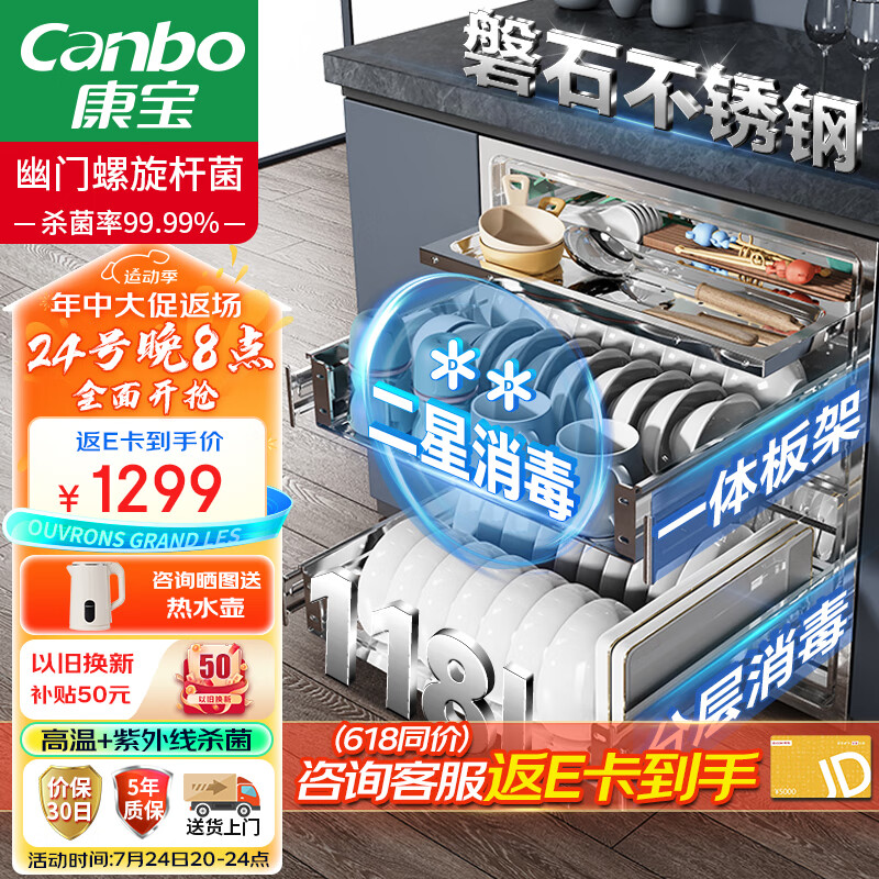 康宝(Canbo)118L三层 不锈钢 磐石 消毒柜 嵌入式 家用 碗筷大容量厨房餐具二星高温板架消毒碗柜XDZ110-EN321价格:1399.00元!