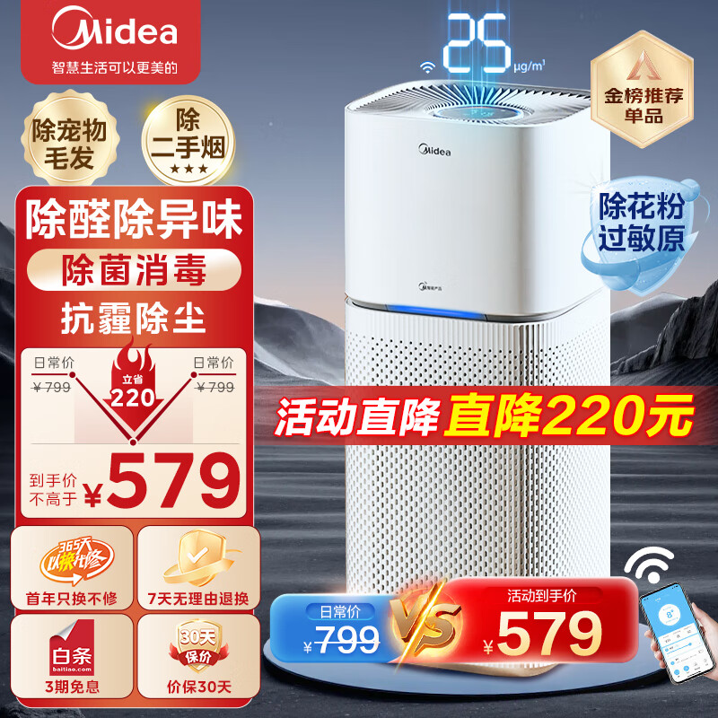 美的(Midea)空气净化器 除甲醛除菌消毒除异味除二手烟除花粉过敏原 吸猫毛宠物净化器 家用新风机轻音设计 【净化除醛】KJ400G-Z1 Pro价格:799.00元!