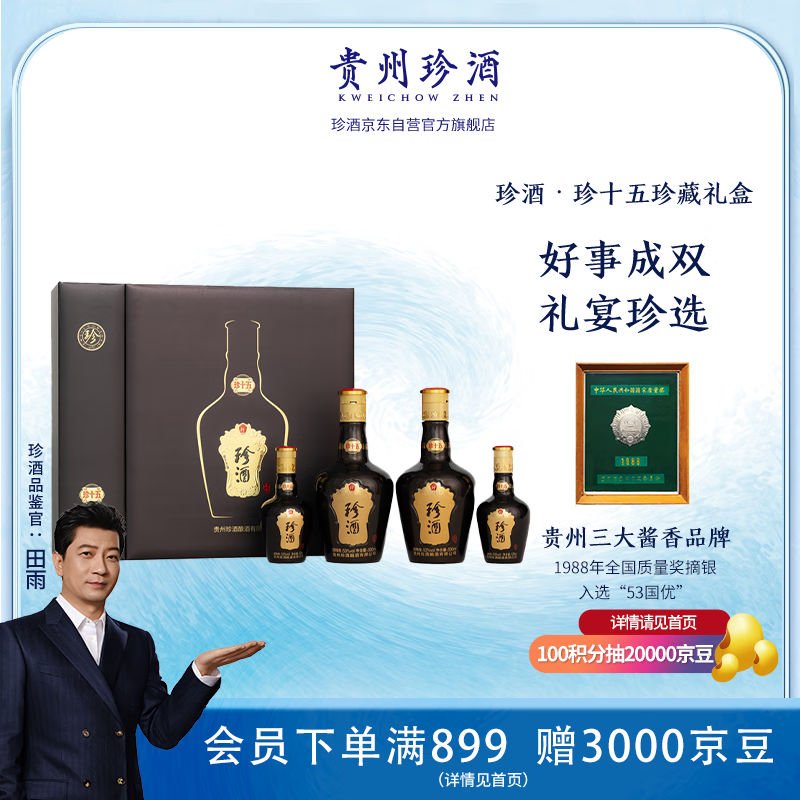珍酒·珍十五(珍藏礼盒) 酱香型白酒 53度 500ML*2+125ML*2 礼盒价格:1100.00元!