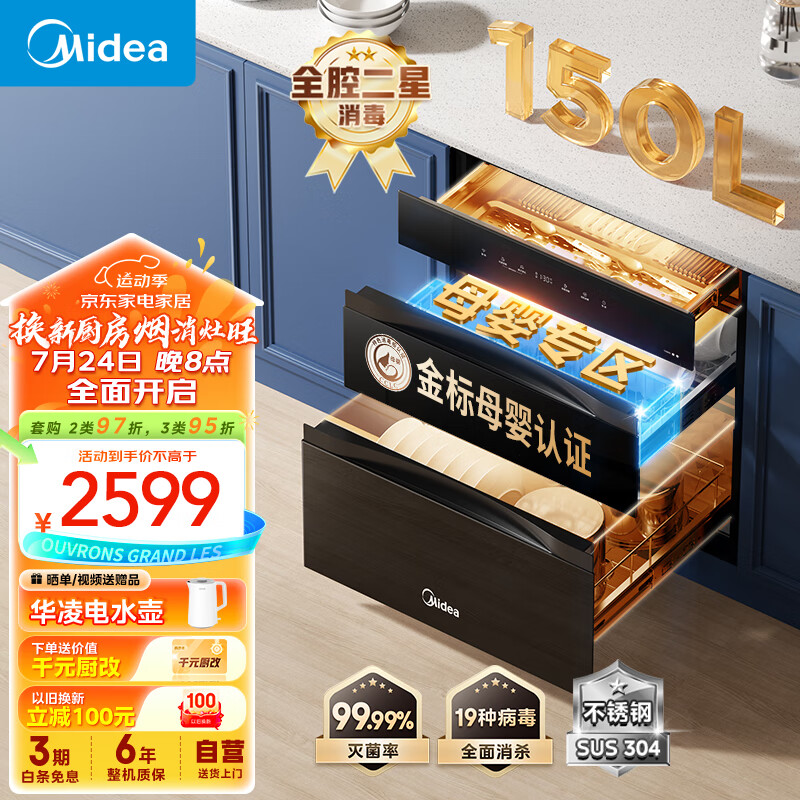 美的(Midea)消毒柜嵌入式家用 厨房餐具碗柜碗筷 紫外线+光波 热风烘干 婴儿奶瓶150L三层大容量灭菌舱150B05价格:2899.00元!