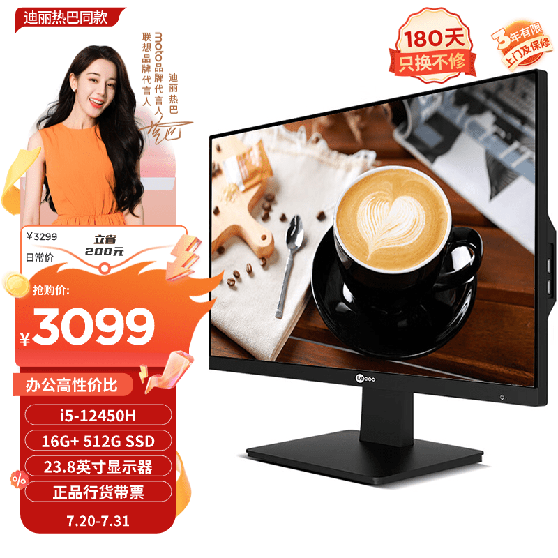 联想来酷 Lecoo一体台式机电脑23.8英寸(酷睿12代i5-12450H 16G 512G 无线键鼠) 黑价格:3099.00元!