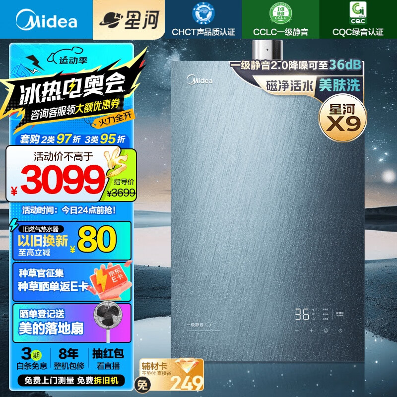 美的(Midea)安睡星河X9天然气16升燃气热水器 一级静音2.0 低噪增容水伺服 磁净阻垢增压188%活水JSQ30-X9星河价格:3099.00元!