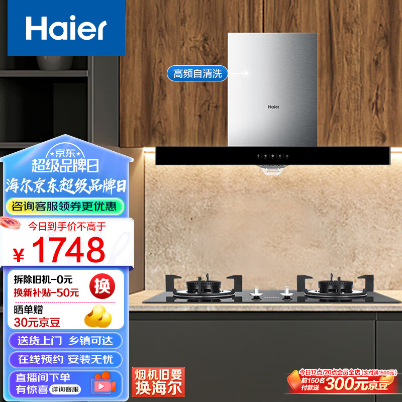 海尔(Haier)抽油烟机 烟灶套装 19m3/min大吸力420pa大风压高频自旋洗家用欧式5.0kW灶T3S+Q2BE2(天)价格:1748.00元!