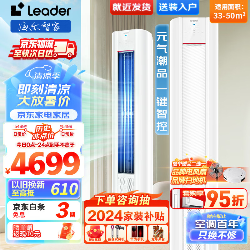Leader柜机空调海尔出品3匹元气一级能效急速降温一键智控节能省电健康自清洁独立除湿客厅立柜空调72LKC价格:4699.00元!