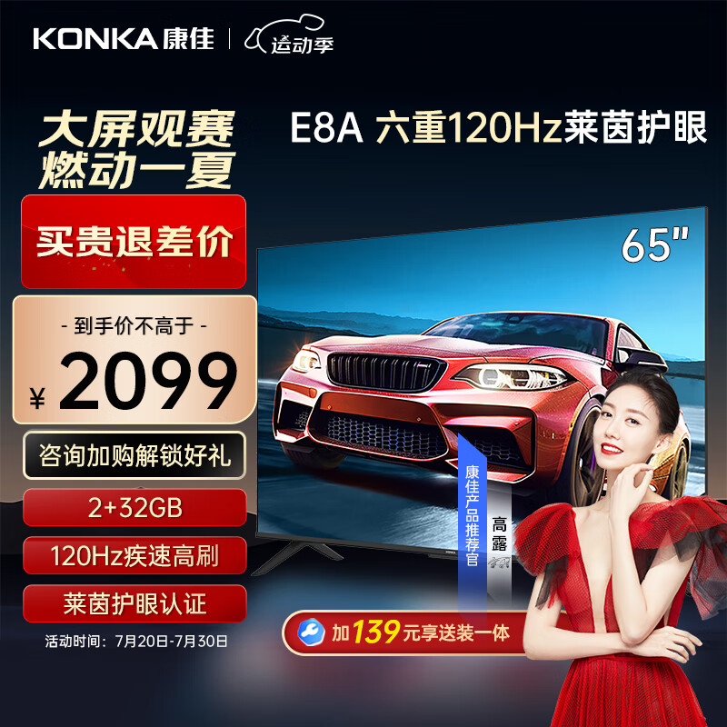 康佳电视 65E8A 65英寸 2+32GB 120Hz高刷护眼电视 4K超清屏投屏 智能语音液晶平板电视机以旧换新价格:2099.00元!