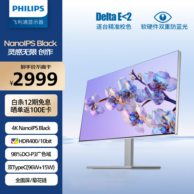 飞利浦 27英寸4K NanoIPS-Black 屏 硬件滤蓝光 TypeC96W 10bit出厂校准HDR400 办公显示器27E2F7901价格:2999.00元!