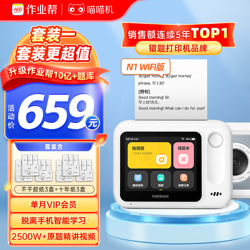 喵喵机N1 作业帮学生错题整理神器家用热敏脱离手机可触屏智能学习错题打印机 WIFI版(套餐一)价格:659.00元!