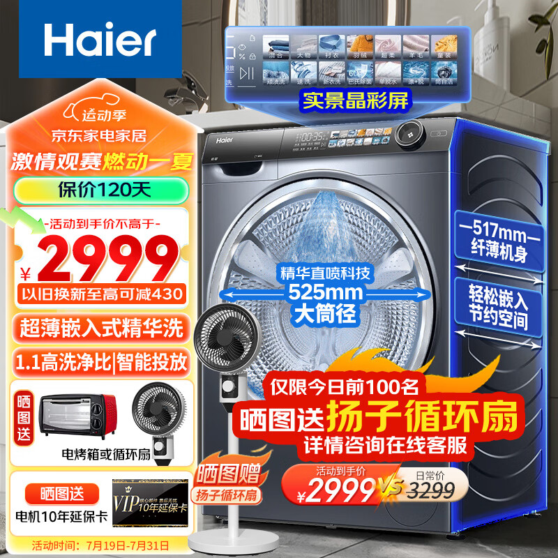 海尔(Haier)洗衣机全自动变频滚筒洗衣机 实景晶彩屏 超薄平嵌大筒径 1.1高洗净比 精华洗直喷科技 智能投放价格:3499.00元!