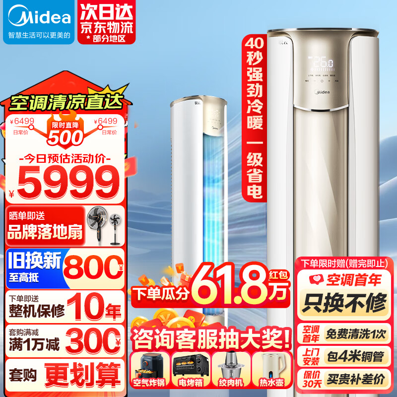 美的(Midea)锐云2代 3匹 新一级能效变频冷暖 大风口自清洁家用客厅立式空调柜机 KFR-72LW/N8XHA1Ⅱ 以旧换新价格:5999.00元!