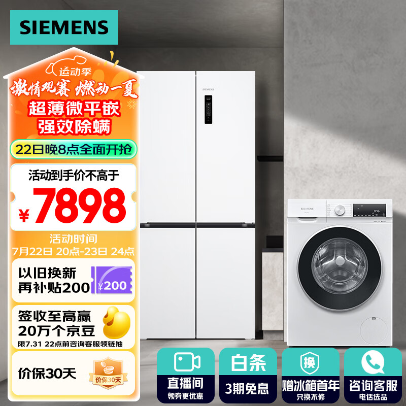 西门子(SIEMENS)冰洗套装497L超薄微平嵌十字星冰箱+10kg除渍洗KC502080EC+WG52A100AW价格:7898.00元!