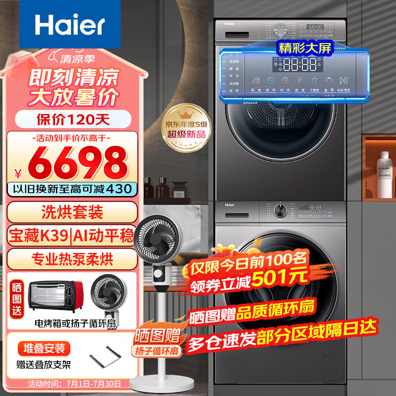 海尔纤美10公斤大容量洗烘套装洗烘组合洗衣机六维减震AI动平衡洗衣机双擎热泵干衣机BD1216+HG100-16价格:7199.00元!