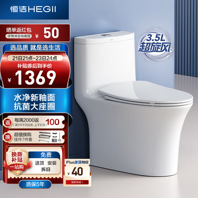 恒洁(HEGII)马桶562 超旋风大冲力抗菌座圈虹吸式家用坐便器HC0562DT-305价格:1829.00元!