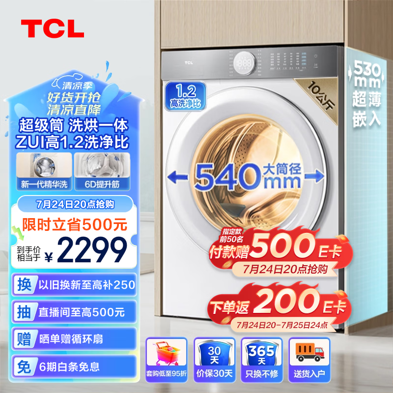 TCL 10公斤超级筒T7H超薄洗烘一体机滚筒洗衣机 1.2洗净比 精华洗 540mm大筒径 以旧换新 G100T7H-HD价格:2798.00元!